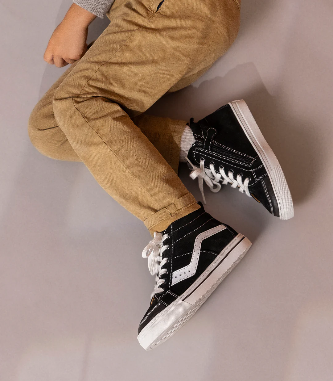 Nahuel est une bottine basse en daim noir au design moderne et urbain. Elle présente une ligne ondulée blanche sur le côté, des coutures décoratives et une semelle blanche à bande noire. Dotée de lacets blancs, elle est idéale pour allier style et confort au quotidien. La bottine Nahuel est en cuir et entièrement doublée. La semelle intérieure en cuir est respirante, antibactérienne et amortissante.
