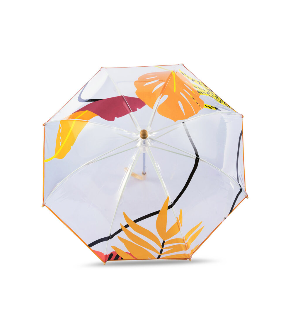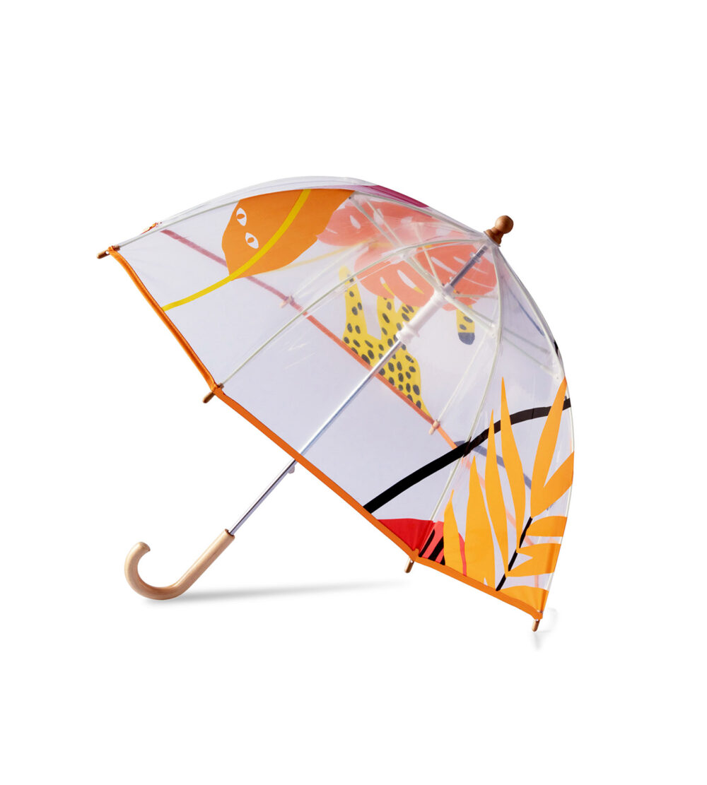 Ce parapluie enfant transparent avec sa cloche imprimée de motifs « Jungle » dans les tons oranges est un parapluie pour une fille ou un garçon à l’esprit aventurier. Chaque jour de pluie, votre petit aventurier explorera une jungle tropicale où il sera accompagné de félins qui se cachent également derrière les feuilles et les lianes !
