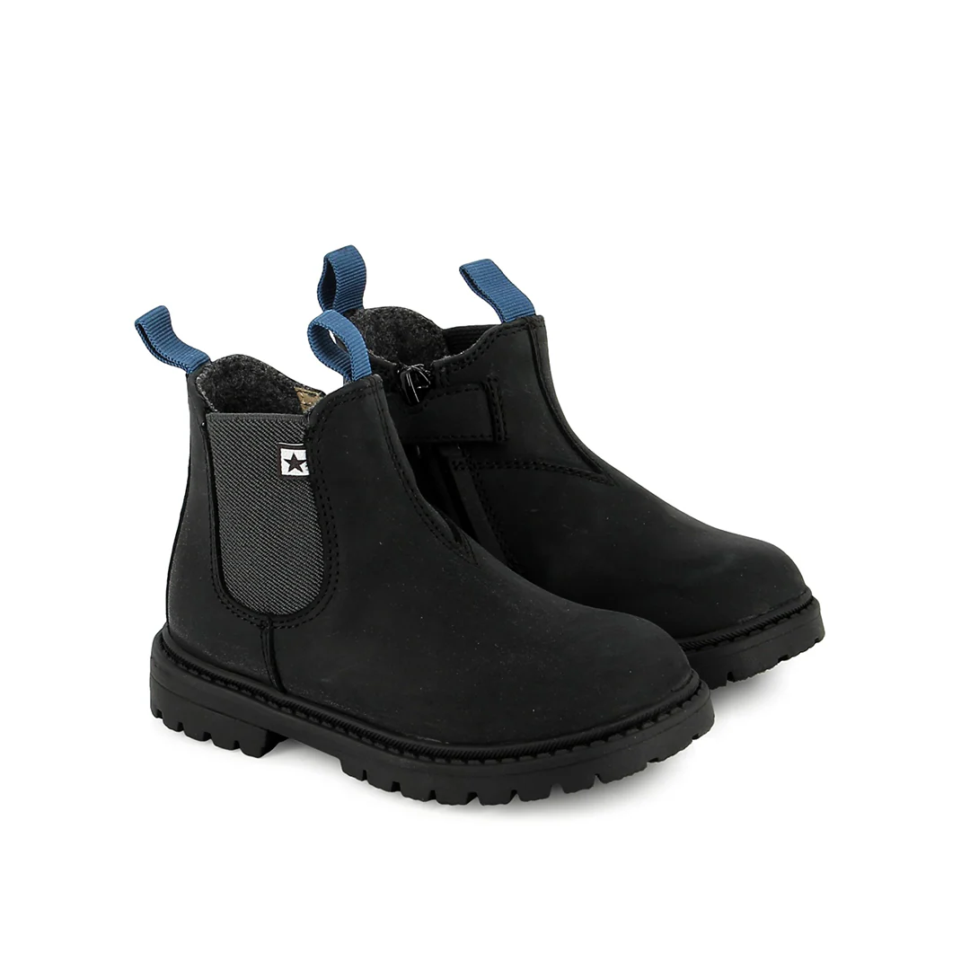 Ces bottines pour enfants sont présentées dans une version en cuir noir. Facile à porter, elles accompagnent les enfants avec style pour la saison hivernale.