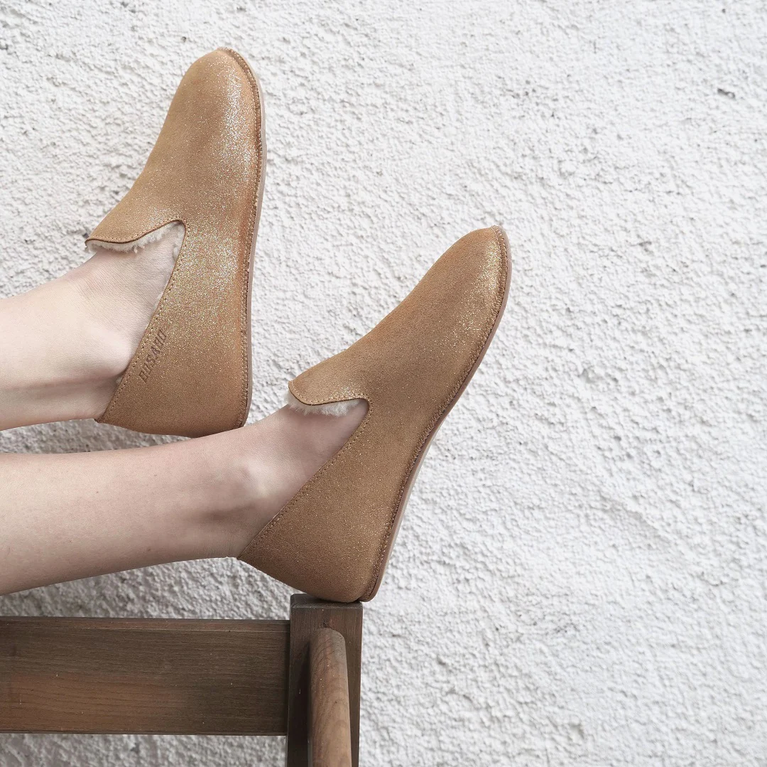 Le chausson Coco sparkling, chic et pailleté, garde vos pieds bien au chaud avec élégance. Fabriqué en France, il allie dessus en cuir velours à paillettes et doublure en laine véritable pour un confort optimal à la maison. Sa semelle microfibre souple est silencieuse. Idéal pour ajouter une touche de brillance à vos moments cocooning tout l’hiver.
