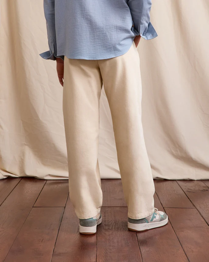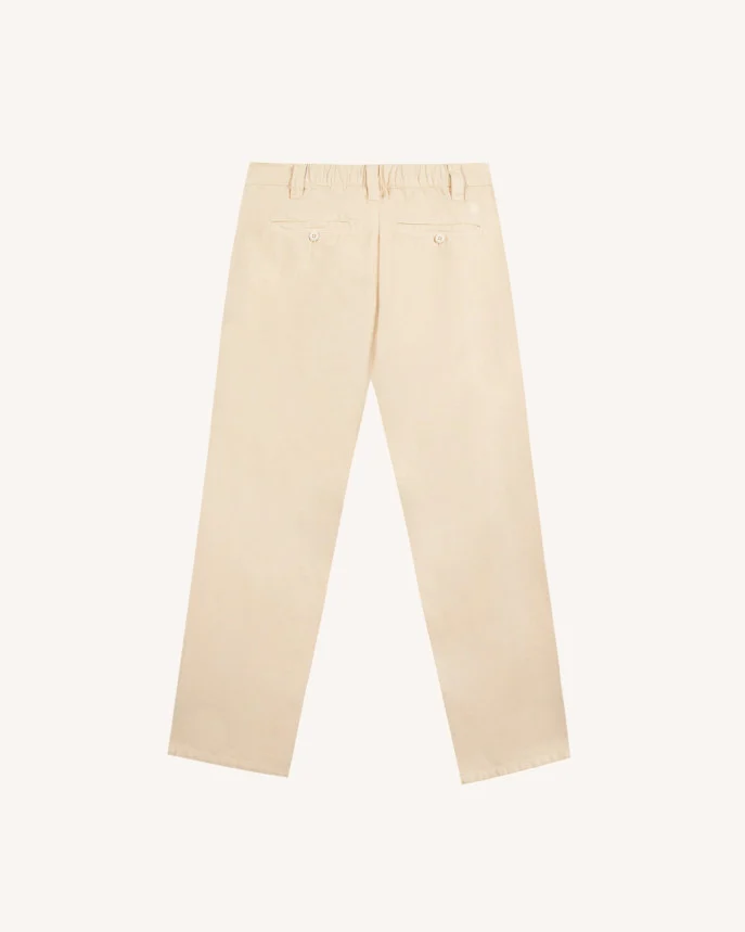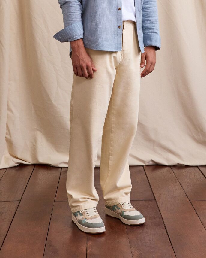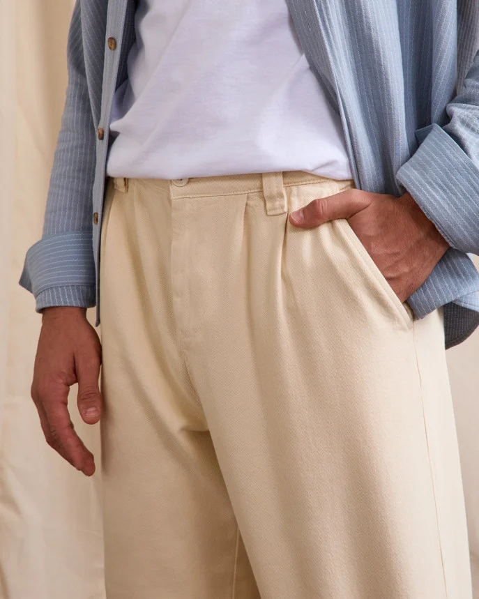 Le pantalon homme écru LANDAIS propose une alternative élégante aux coupes classiques, avec une silhouette large et fluide. Sa matière en twill souple assure un tombé naturel et un confort immédiat. Les doubles pinces à l’avant structurent la jambe, tandis que la taille élastiquée au dos facilite l’ajustement sans compromettre le style. Teint en pièce, il présente un rendu doux et légèrement patiné. Une pièce contemporaine, idéale pour composer des looks épurés et responsables, du quotidien aux moments plus habillés.