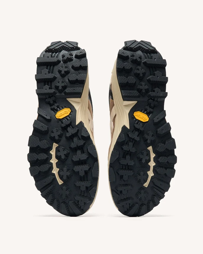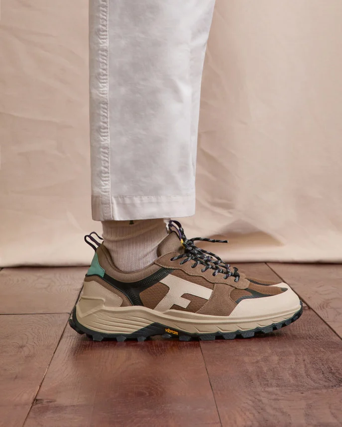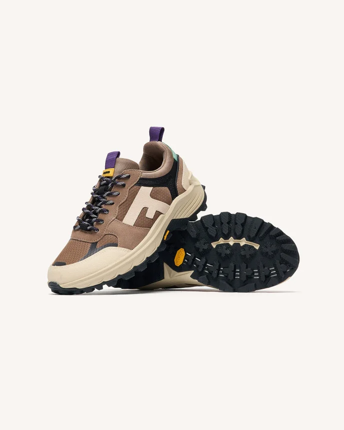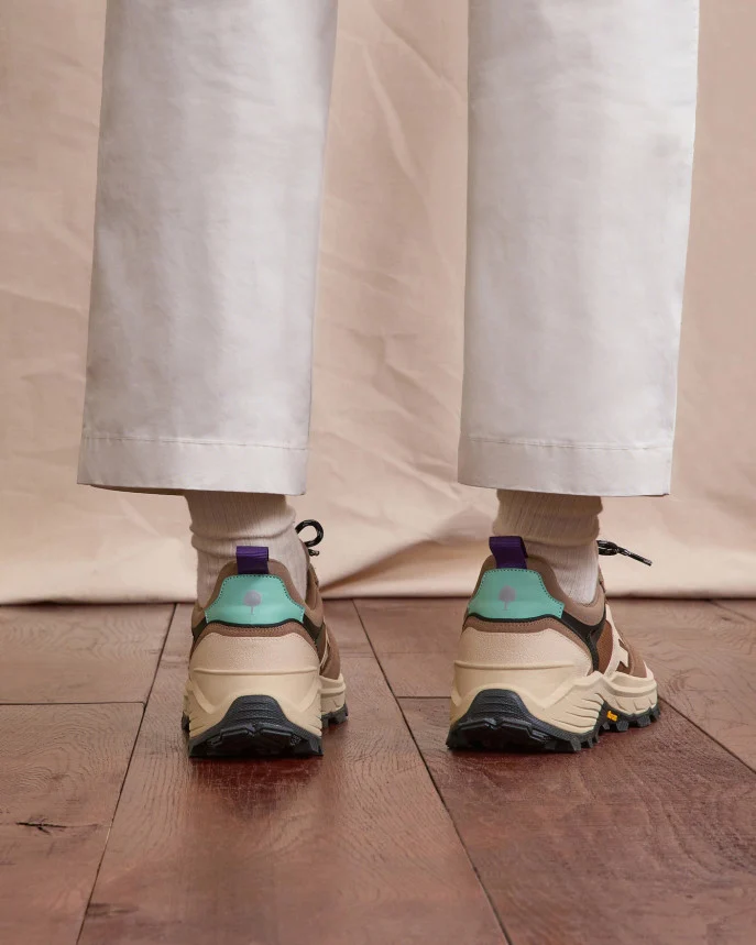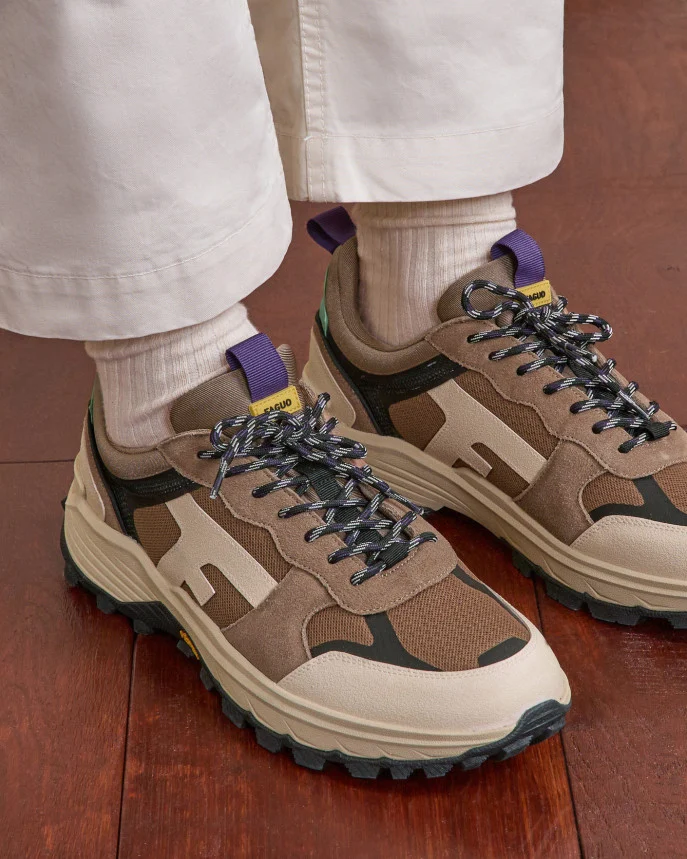 Les baskets homme beige clair HAZEL MONSTERA sont pensées pour le mouvement. Leur semelle Vibram à crampons assure une excellente adhérence, tandis que leurs matériaux robustes — polyester recyclé, cuir suède et caoutchouc — leur confèrent stabilité et confort. Leur allure outdoor s’adapte aussi bien à l’exploration qu’à la ville. Entretien : Appliquez un imperméabilisant avant la première utilisation