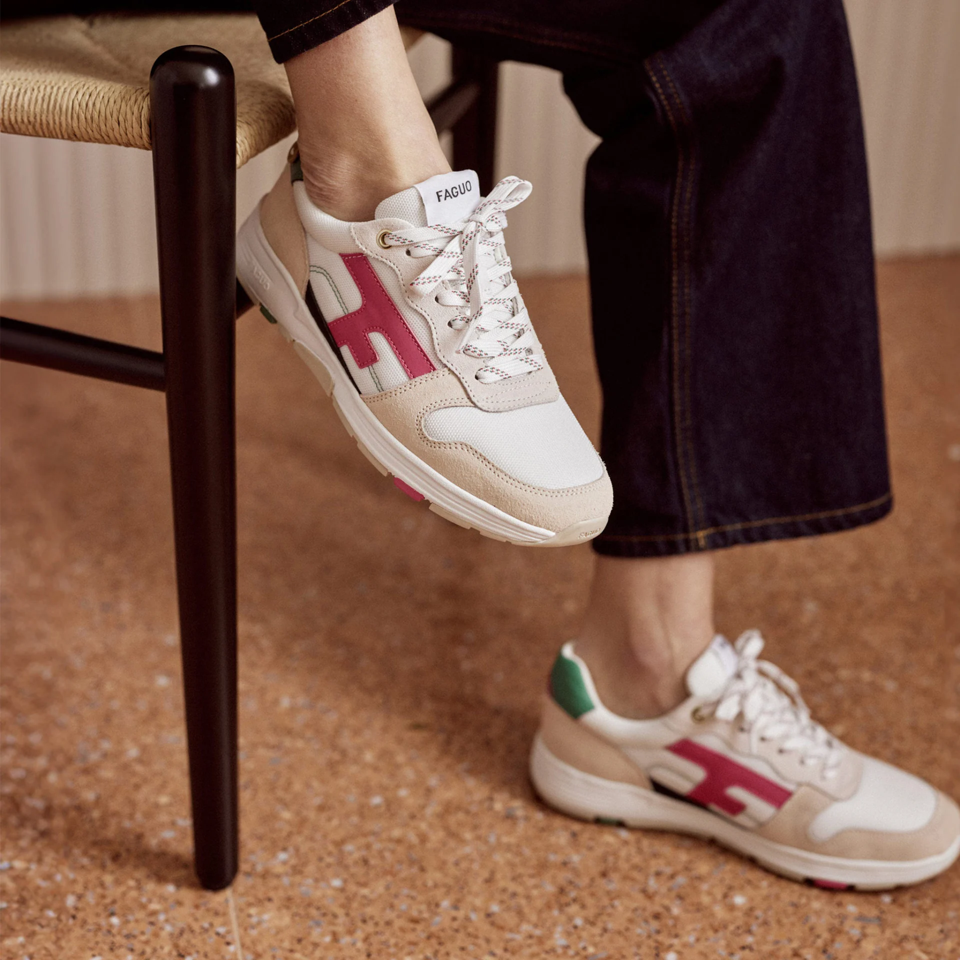 Sa tige en polyester recyclé illustre l’engagement de FAGUO pour une mode plus respectueuse de l’environnement. Les empiècements en cuir suède et PU ajoutent une touche élégante et renforcent la structure du modèle, assurant ainsi durabilité et esthétique. Pensée dans le studio FAGUO, la basket verte et rose OLIVE intègre la technologie de semelle Flexway, dotée de deux points de flexion à l’avant. Cette innovation accompagne naturellement le mouvement du pied lors de la marche, offrant une expérience fluide et agréable.
