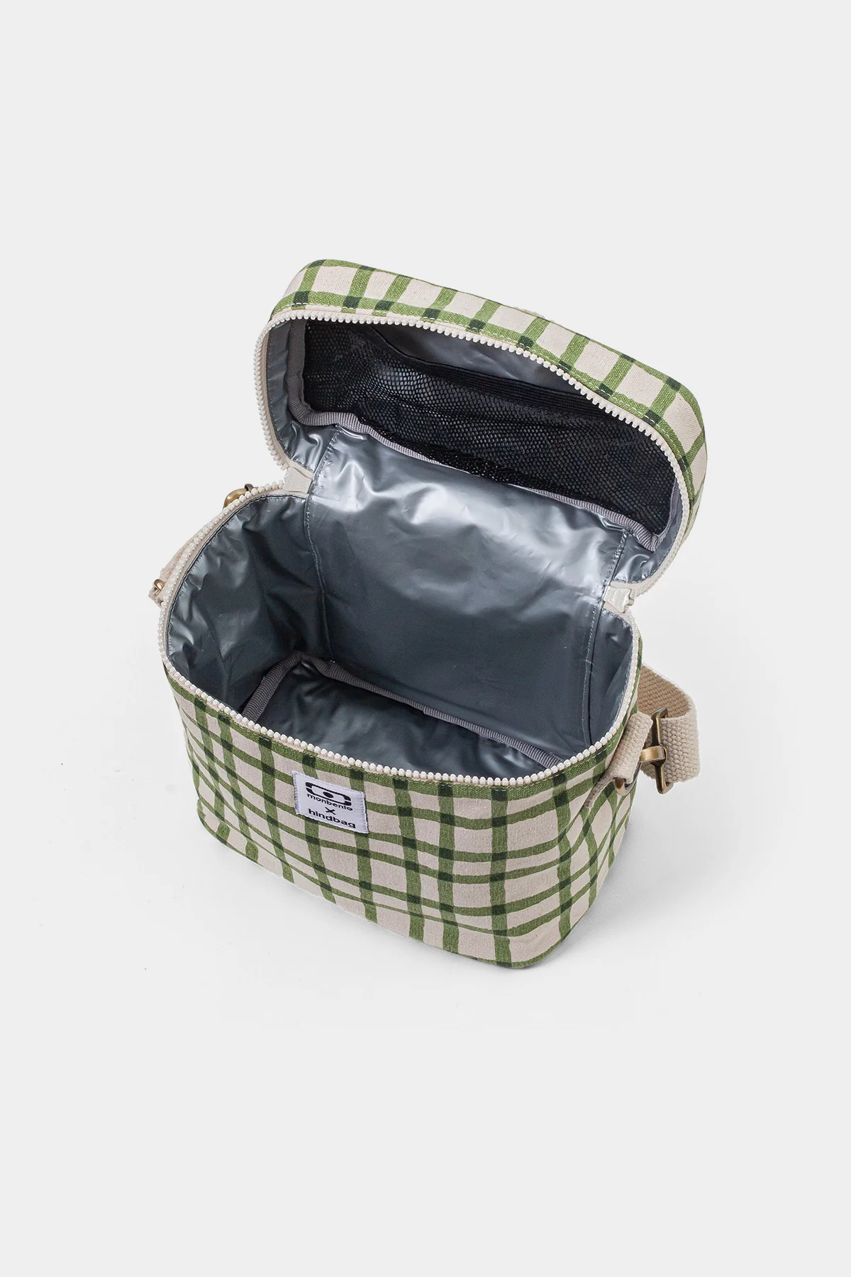 Confectionnée en coton naturel certifié GOTS, la lunch bag est dotée d’une sangle en coton écru et de finitions métalliques finition laiton vieilli (brass antique).