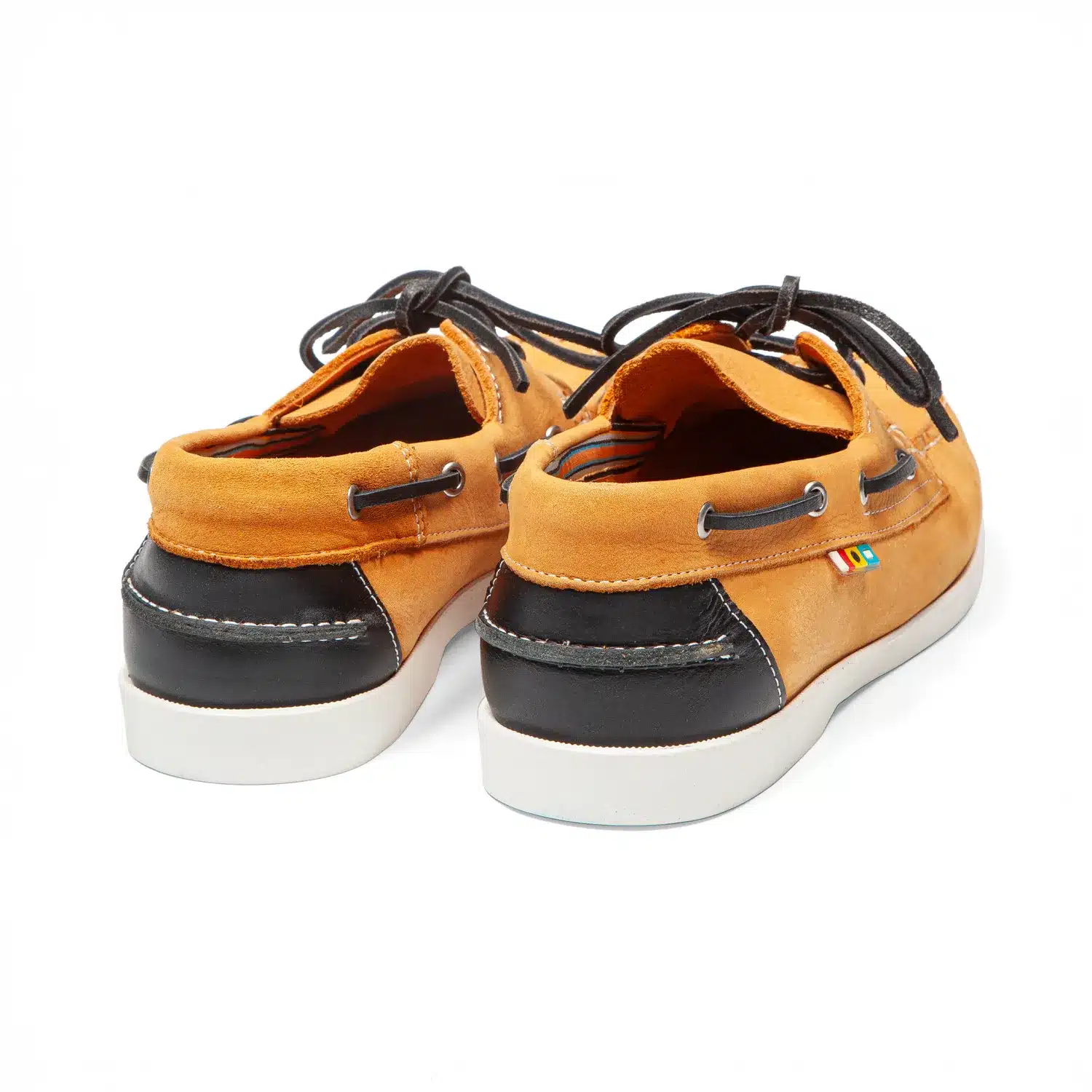 Véritable chaussures de pont ! Le cuir respire, la semelle accroche, vos pieds ne se plaignent jamais. Ce bicolore safran-marine éclatant s’accorde naturellement au jean clair, au short blanc, à la chemise en lin marine. Un mariage de couleurs qui assume pleinement l’énergie méditerranéenne.