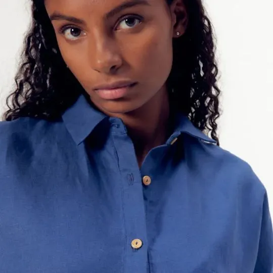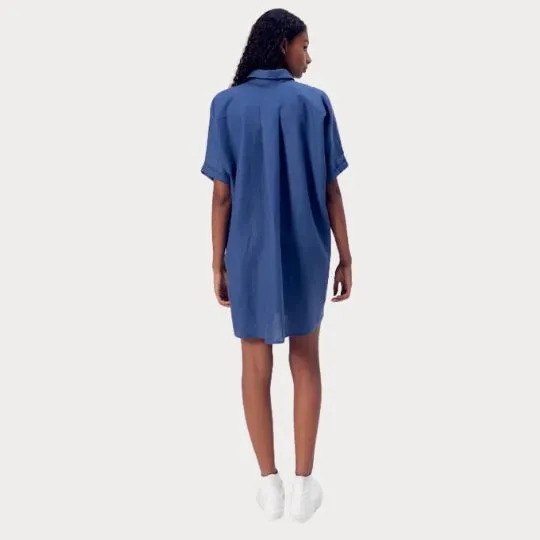 Robe Léonie en lin bleu, coupe oversize, fabriquée en France. Idéale pour un style décontracté et écoresponsable.
