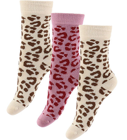 Superbes chaussettes MiniPop, vendues en 3 Pack : deux paire beiges et une paire rose, toutes ornées d’un motif léopard dans des tons marron. chaussettes sont dotées d’un bord côtelé fin sur le haut pour un ajustement parfait. Leur design leur confère un look moderne et élégant.