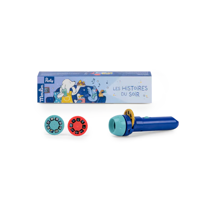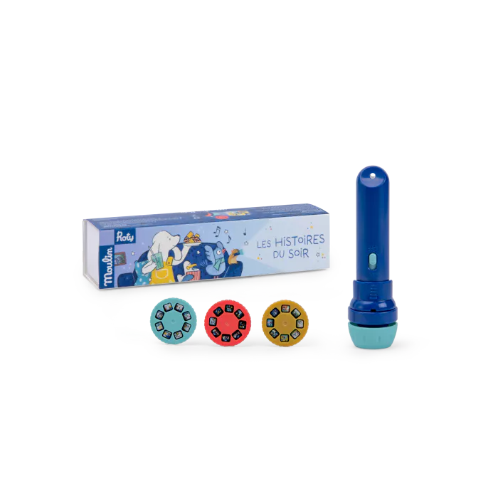 Imaginer et raconter des histoires devient un jeu d’enfant avec la lampe torche de poche! Comprend une lampe à projeter et 3 disques pour imaginer de belles histoires avant de s’endormir le soir. On éteint la lumière pour que la magie opère et c’est parti…