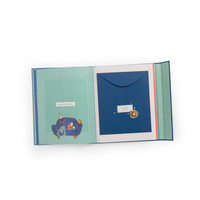 Ce livre à trésors de 80 pages illustrées accompagne l’enfant de ses premiers jours à ses 6 ans. Un recueil de mots et d’images, avec 6 enveloppes à souvenirs et 1 toise en cadeau. Fermeture aimantée, et textes non genrés pour l’enfant et les parents.