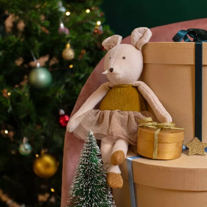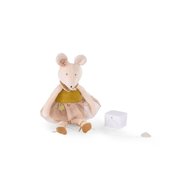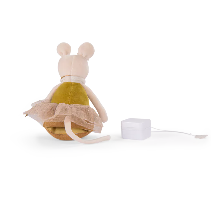 Poupée souris musicale en velours éponge, vêtue de sa plus belle tenue de ballerine, elle accompagnera bébé aux pays des rêves avec sa douce mélodie. Tirez sur sa queue pour lancer la musique. La boîte à musique s’enlève pour la passer en machine.
