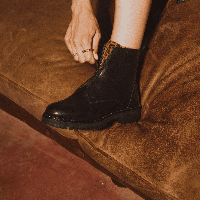 Affirmez votre style avec les bottines Dickson Cuir/Leo Noir, audacieuses et élégantes. En cuir lisse noir avec languette imprimé animalier, elles se distinguent par leurs zips latéraux pour un enfilage rapide. Leur tige de 13 cm, semelle crantée et talon de 3,5 cm allient confort et allure urbaine. Fabriquées au Portugal, elles se portent avec jean, robe midi ou pantalon cuir.