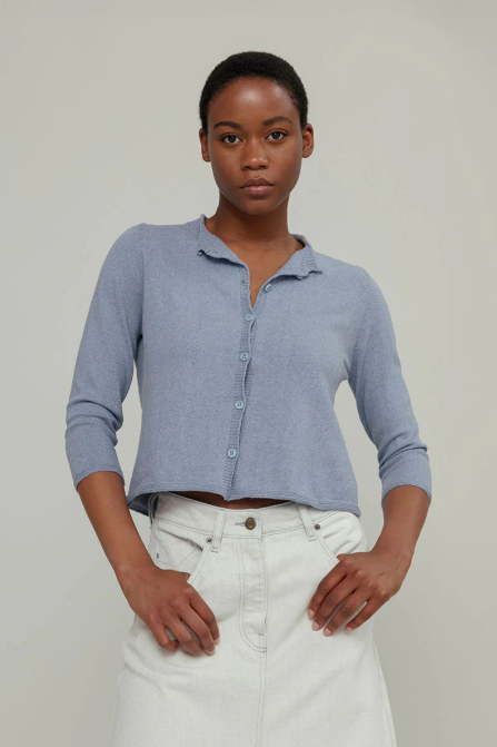 Cardigan court pour femme à manches longues, entièrement réalisé en fil de coton recyclé et biologique. Leda est un cardigan léger à col rond boutonné, parfait pour les mi-saisons. Le col, les poignets et le bas côtelées donnent une ligne droite au vêtement sans serrer.