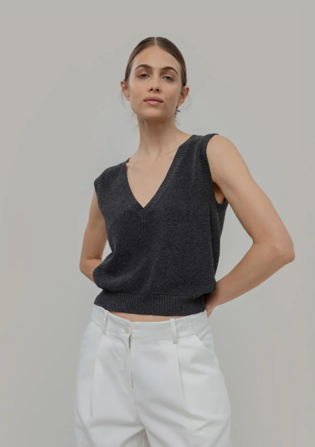 Le col en V et le point de tricot structuré rendent ce gilet élégant, tandis que les finitions en côtes ajoutent structure et caractère.