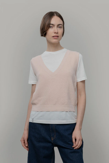 Elodie est un gilet en maille pour femme, fabriqué en 50 % coton recyclé et 50 % coton biologique, une matière durable, respirante et naturelle.