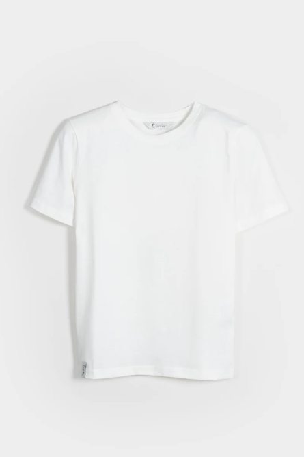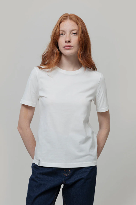 Le t-shirt Mimma pour femme est une pièce basique et polyvalente, en coton biologique et coton recyclé à partir de déchets industriels.