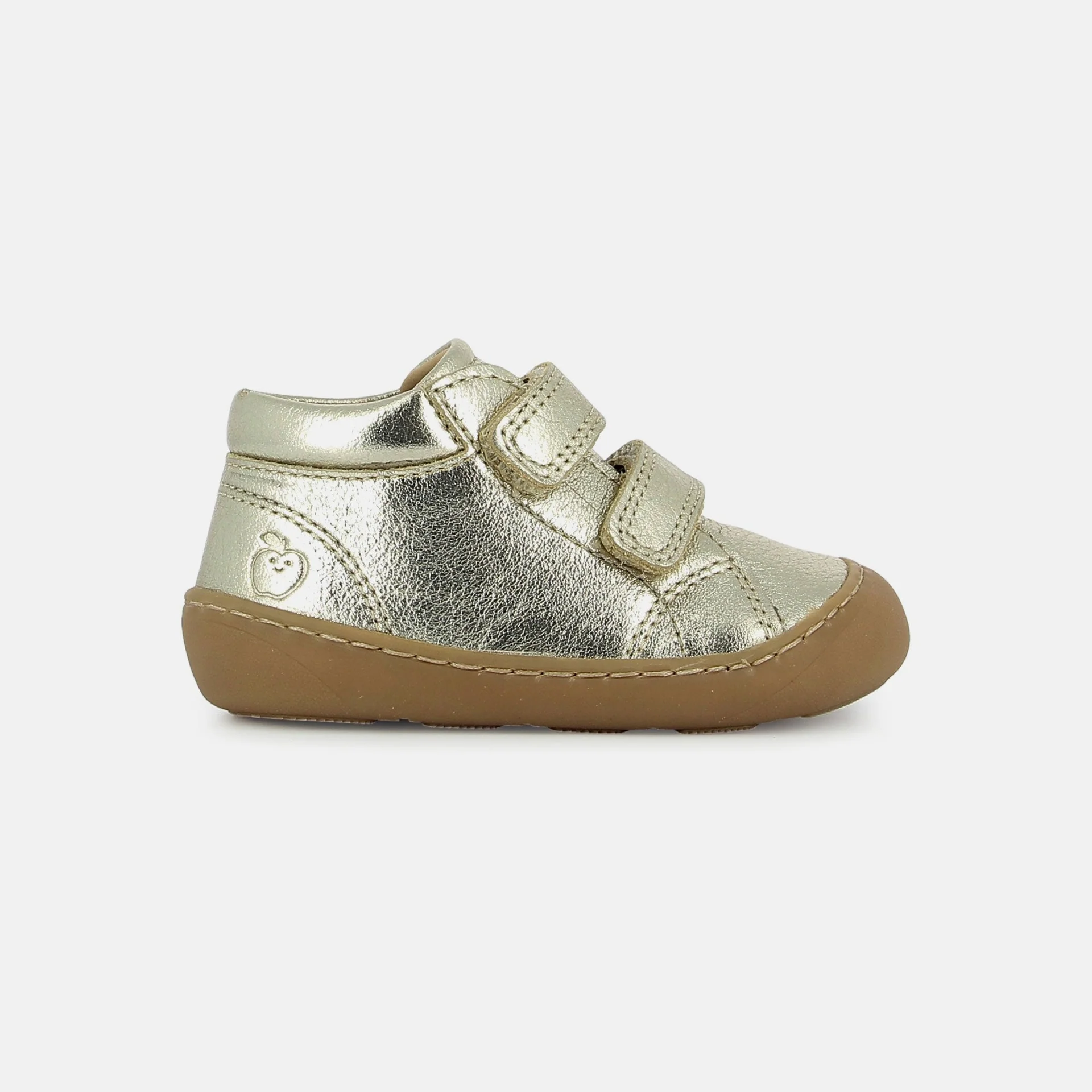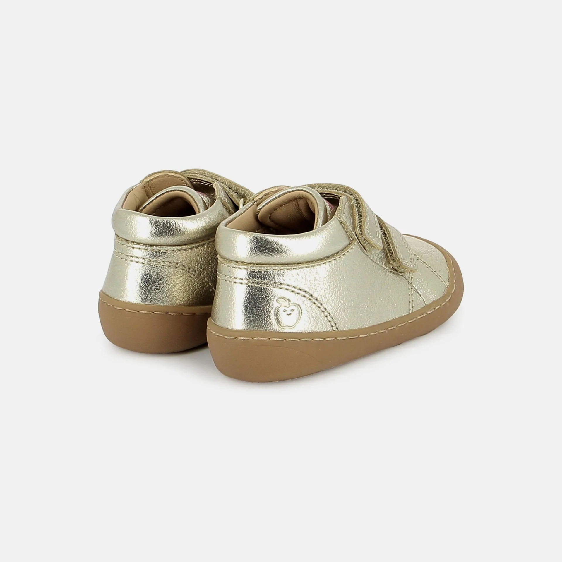 Cette chaussure barefoot en cuir métallisé doré Shoo Pom est conçue pour accompagner bébé dans l’apprentissage de la marche, en offrant la sensation la plus proche de la marche pieds nus, tout en protégeant le pied.