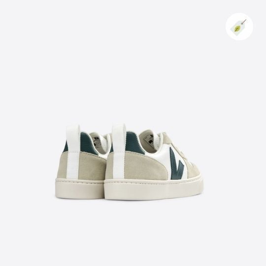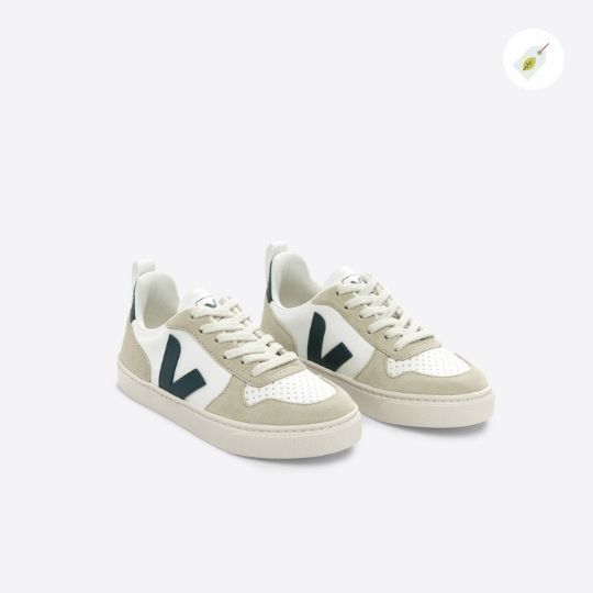 Les baskets enfant V-10 LACES CHROMEFREE LEATHER WHITE BRITTANY ALMOND de chez VEJA sont fabriquées avec du cuir ChromeFree, un cuir bovin tanné sans chrome, provenant de fermes situées au sud du Brésil. Ce cuir subit un processus de tannage innovant qui n’utilise aucun chrome, métal lourd ou acide dangereux, réduisant ainsi la consommation d’eau et d’énergie. Les chaussures présentent des empiècements en suède et en cuir ChromeFree, ainsi qu’un logo V en caoutchouc d’Amazonie. La semelle intérieure est composée de canne à sucre et de coton biologique, tandis que la semelle extérieure est en caoutchouc d’Amazonie. Les chaussures V-10 LACES CHROMEFREE LEATHER WHITE BRITTANY ALMOND sont fabriquées au Brésil, dans le respect de normes éthiques et environnementales strictes.